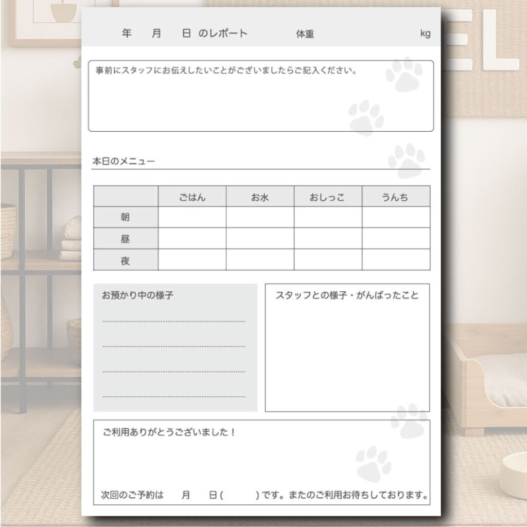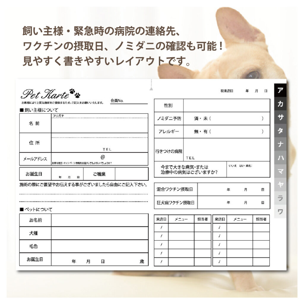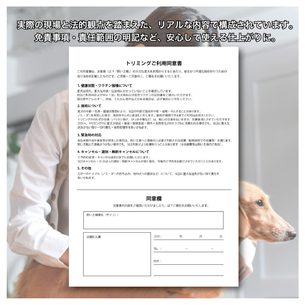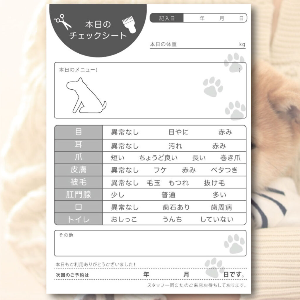 ドッグサロンやペットホテルに使用できるカルテ・チェックシート・同意書です。